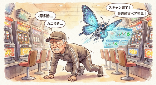 | カニ歩き 良い台を探して移動を繰り返す。 店員に怒られるリスクあり。 | 多通貨監視 複数の通貨ペアを同時に監視し、 チャンスの台だけを打つ。 |