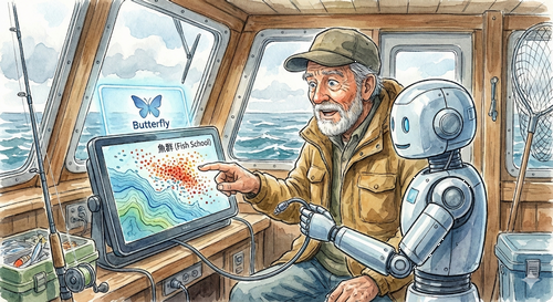 | 魚群探知機 見えない魚を見つける機械。 プロの必需品。 | Butterfly(AI分析) 見えないトレンドを見つける機械。 投資家の必需品。 |