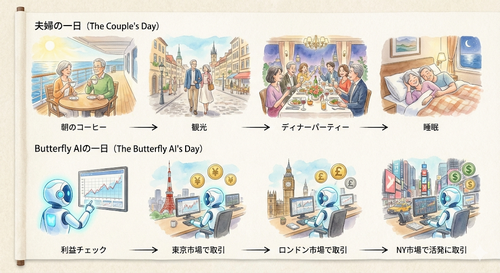 | 23:00 就寝 | 波音を聞きながら深い眠りへ。 (あなたが寝ている間、ButterflyはNY市場で最も活発に稼働!) |