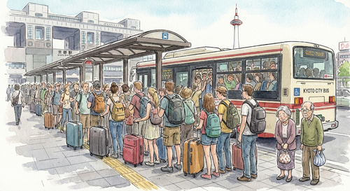 | 移動手段 観光の快適さを左右する。 | 満員の市バス 230円 | MKタクシー 貸切 |