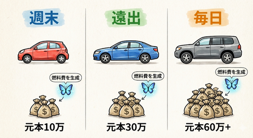 毎月のガソリン代に使わず、利益を再投資(複利運用)し続ければ、数年後には次の愛車の頭金、あるいは全額キャッシュで支払える額に育つでしょう。