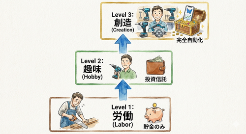| Lv.1 (労働) | 「節約のため」に汗だくで作業。 道具は安物で我慢。 | 銀行預金のみ。 お金も自分も働いている。 |